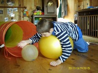 Anouk exécute volontiers les parcours "d'escalades" réalisés dans sa chambre, totalement aménagée en espace de jeux et travail, éveil et stimulation. Il commence à tirer sur ses bras pour essayer de se mettre debout. Il est suivit régulièrement par un ostéopathe, et environ tous les deux mois, par une chiropraticienne.